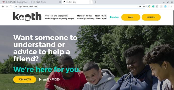 Kooth is an online support website for children aged 11-16 for free, safe and anonymous online support for young people. is an online counselling and emotional well-being platform for children, accessible through mobile, tablet and desktop.