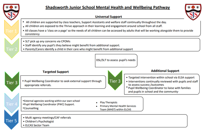 At Shadsworth Junior School we have a pathway we follow for all pupil's wellbeing. We have incredible support within our school and, if needed, are able to work with outside agencies to continue the support.