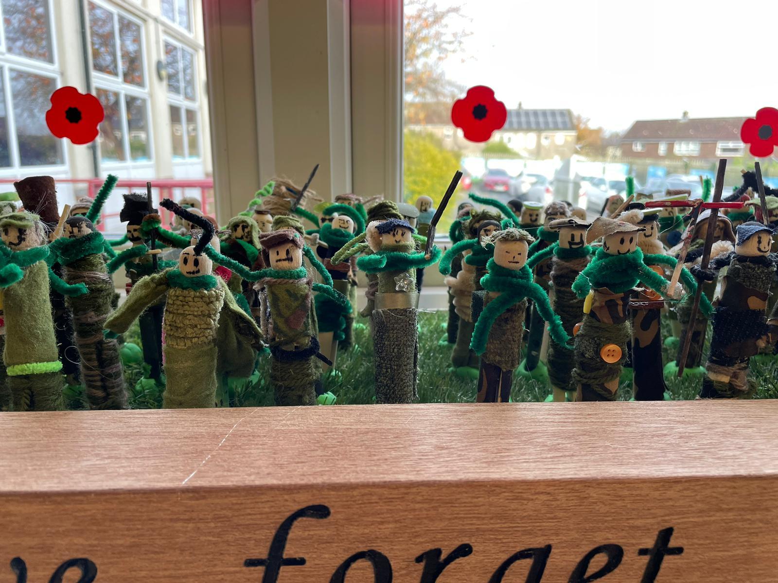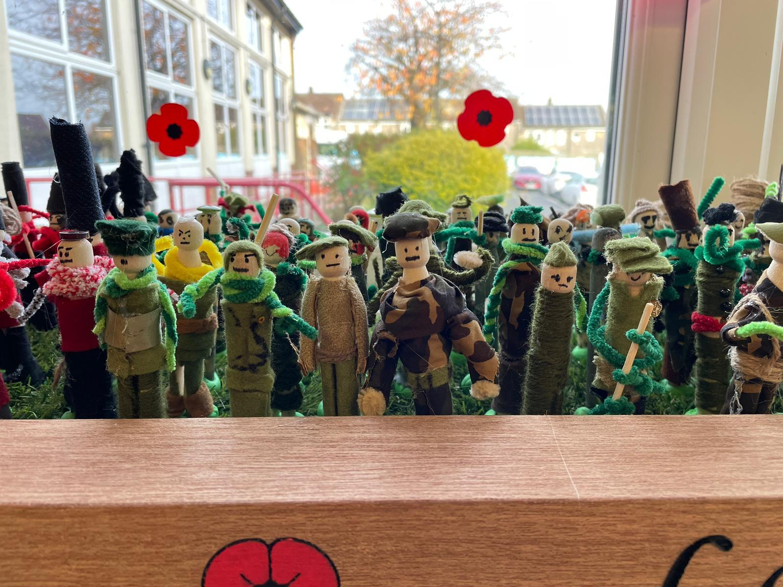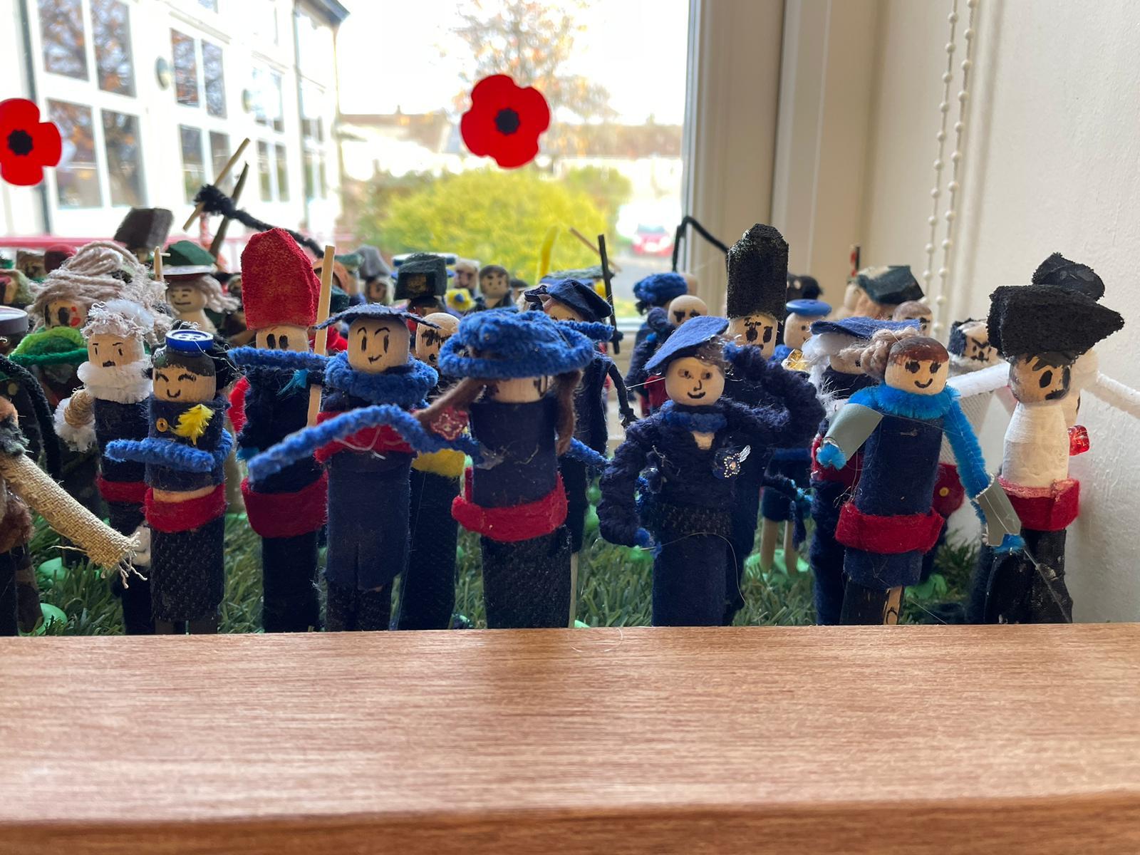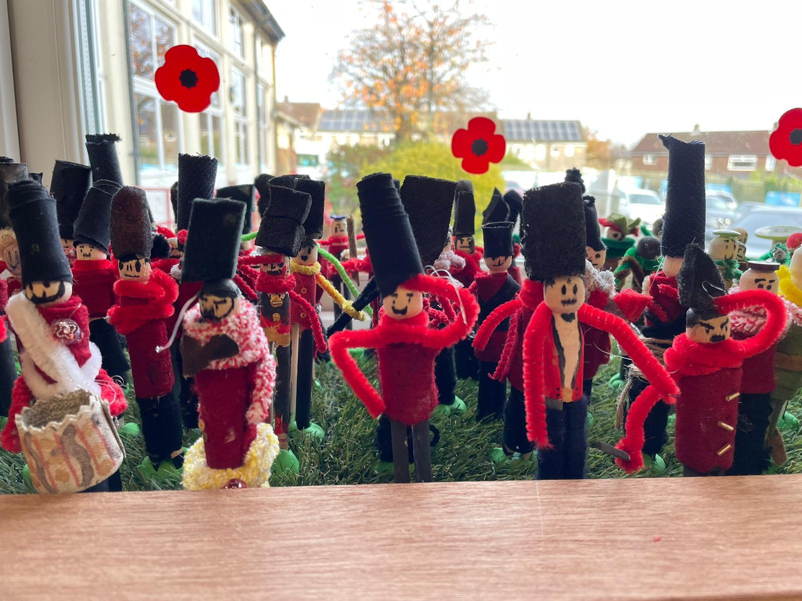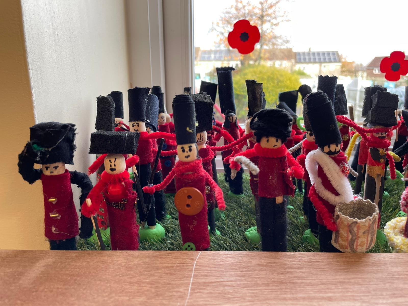 Each person was given a wooden dolly peg and asked to design their soldier to be part of the battalion. What would 237 soldiers look like displayed together? The children learnt about the British Armed Forces and looked at a range of uniforms from various army regiments, both past and present.