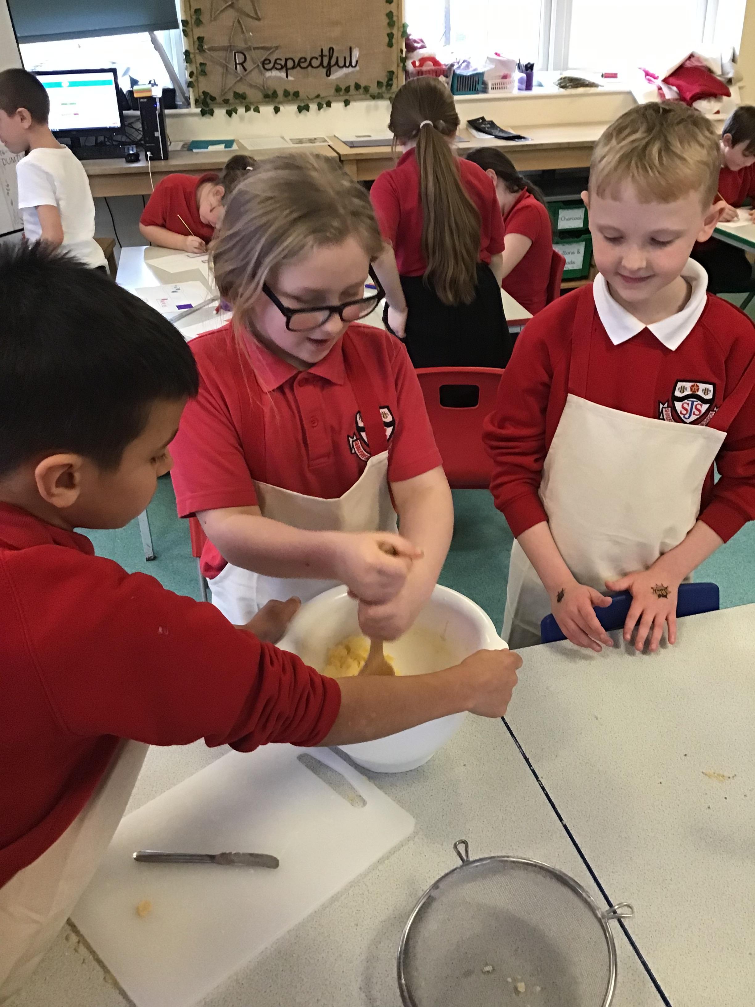 The children then followed a simple recipe to bake their own plain biscuit. It was lovely to see the children working together as a team to ensure that their ingredients were measured accurately.