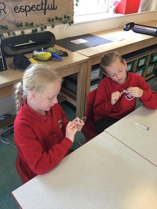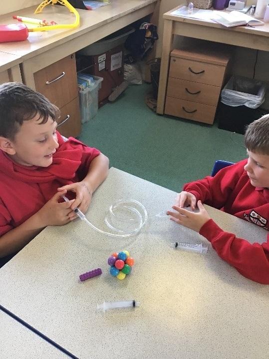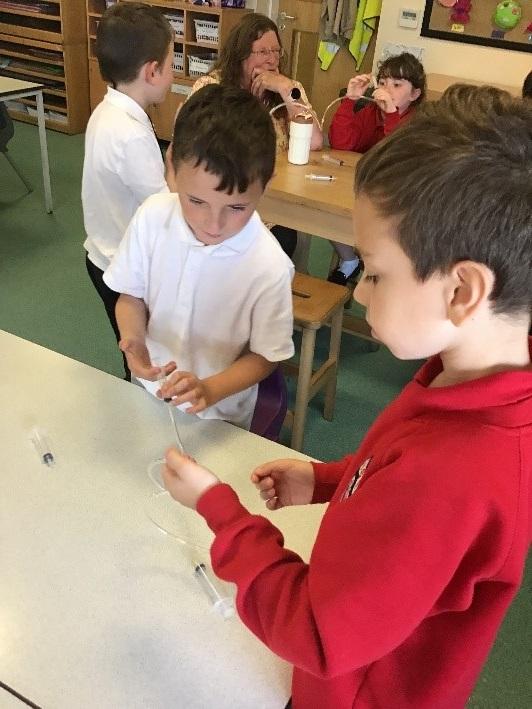 We then came back into the classroom and discussed how most car tyres are called pneumatic and what compressed air is. We discussed whether all machines work using electricity and how machines used to work before electricity was discovered. Our task then was to experiment making our own pneumatic system using plastic tubing and two syringes. We had lots of fun and were amazed when the syringe plungers moved as we pushed the air through the plastic tubing.