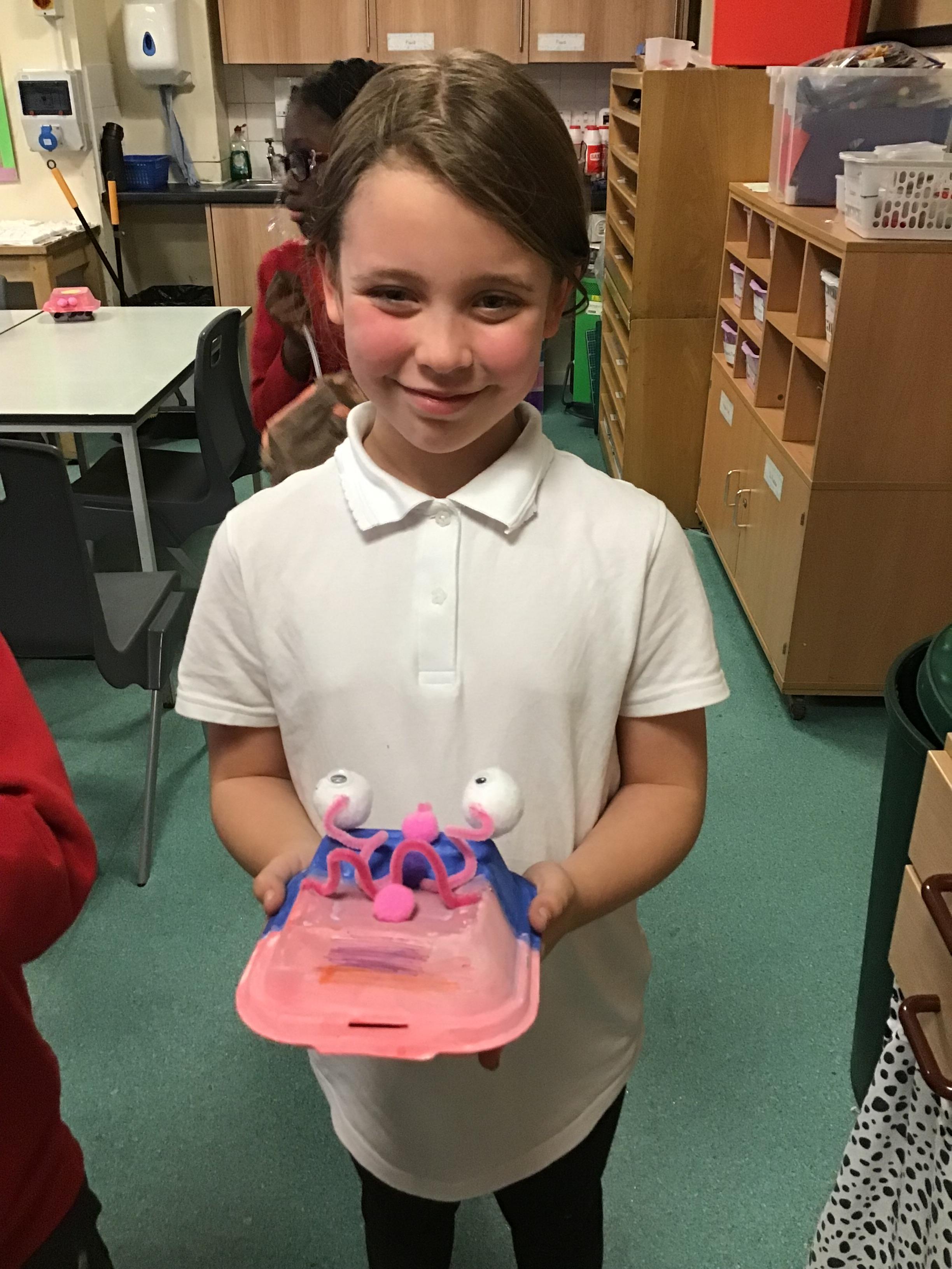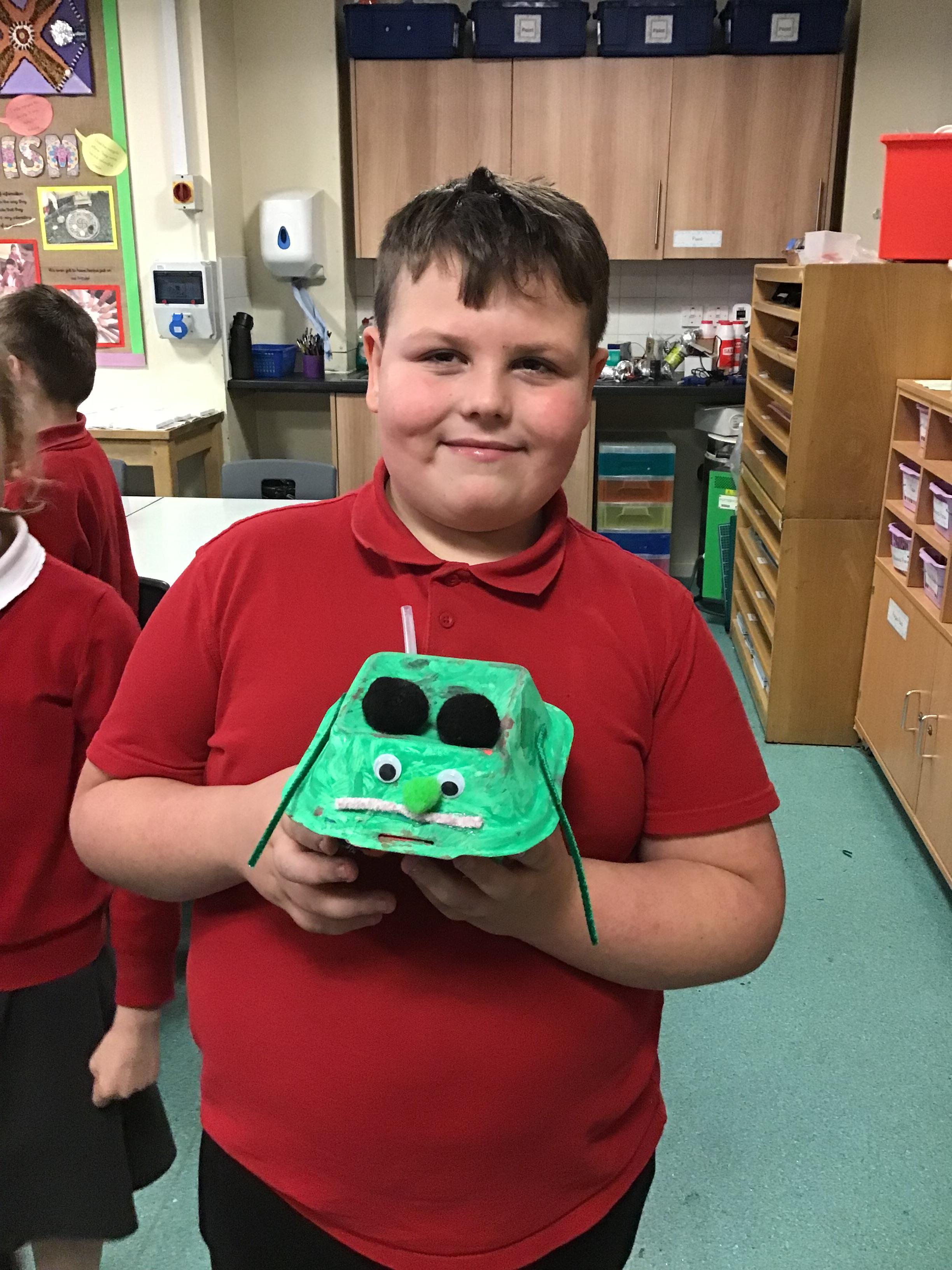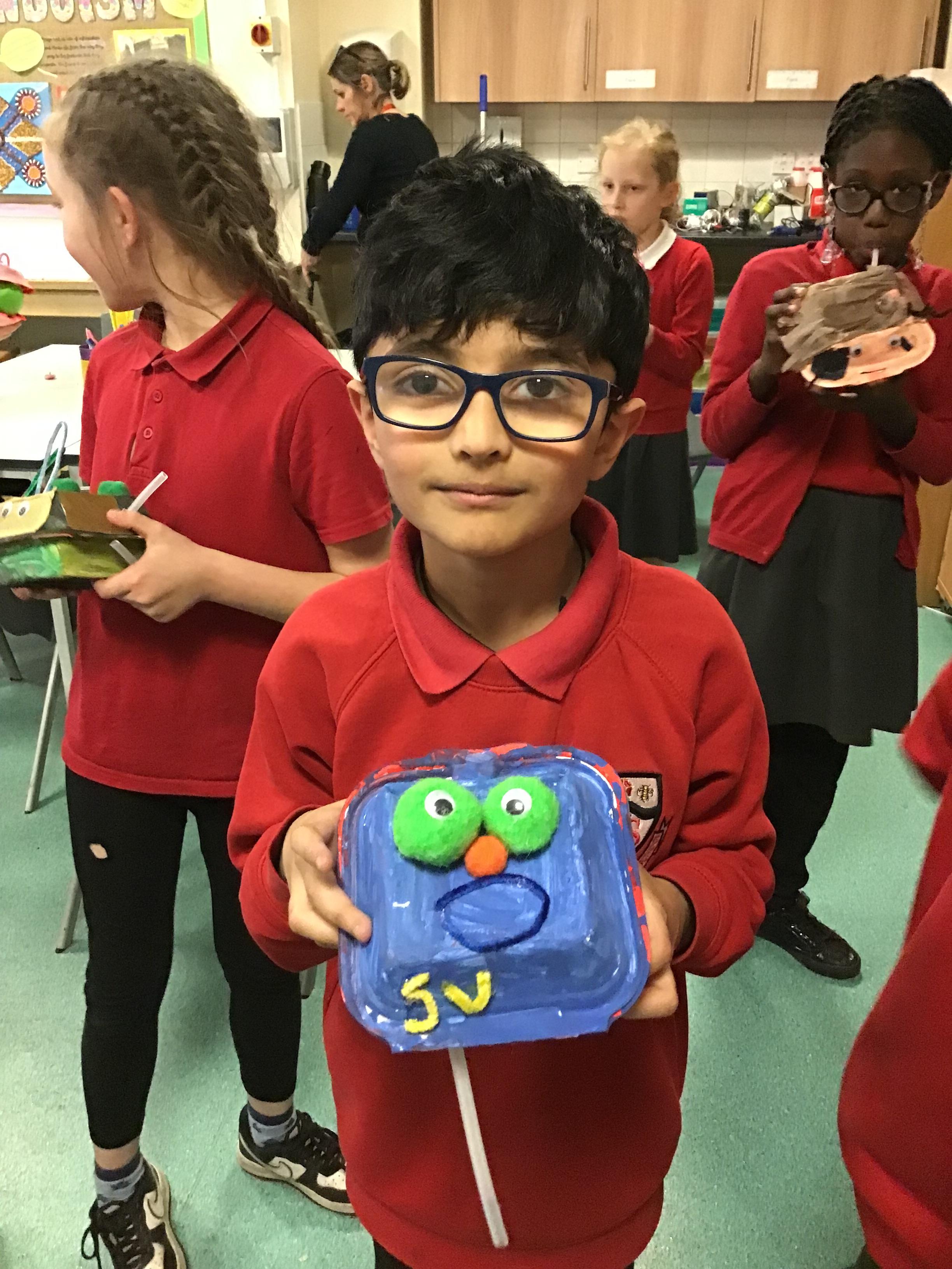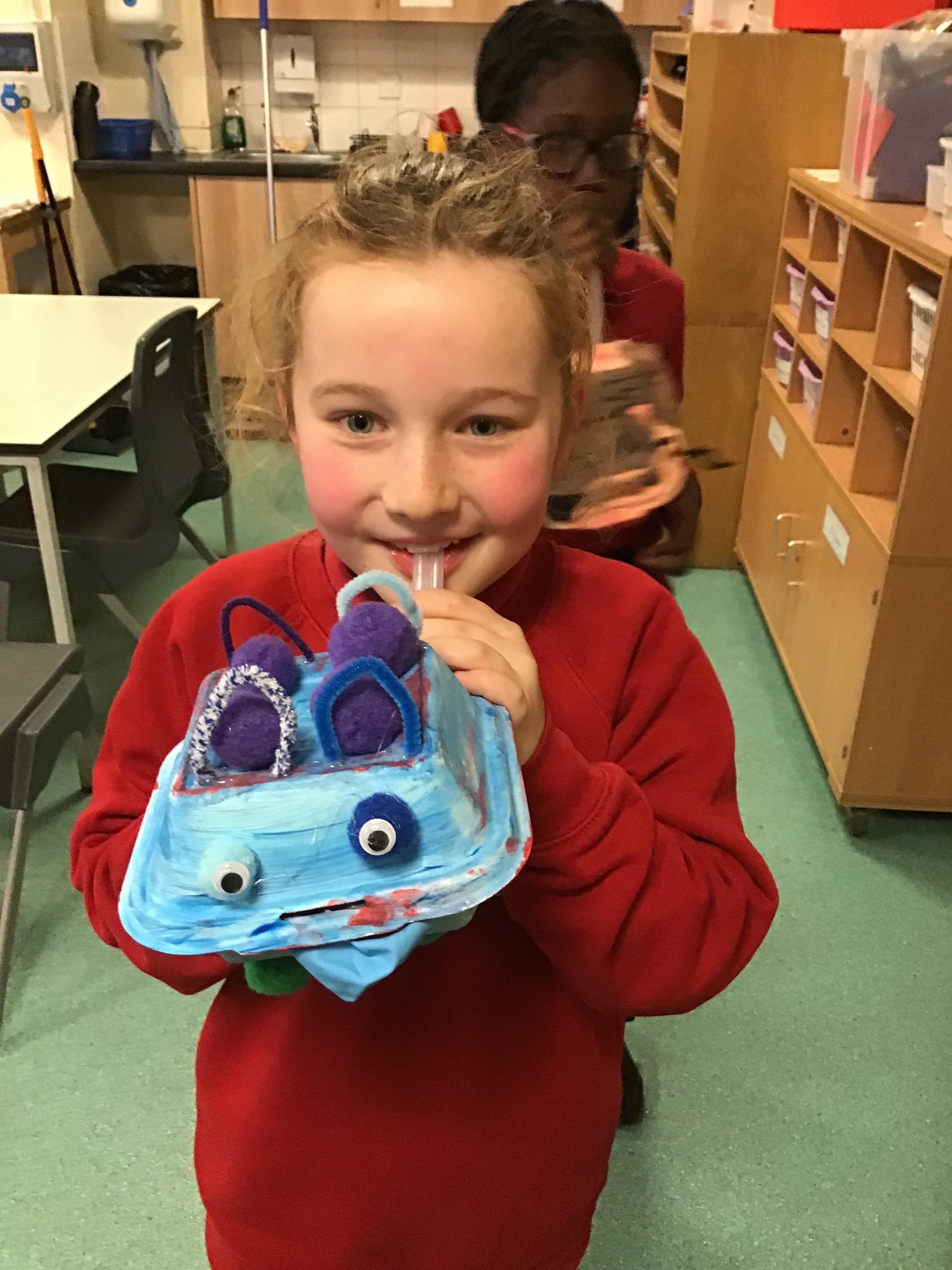 We then spent two weeks creating our final pieces. First, we looked carefully at our plans before painting both the inside and outside of our toy. We then had to let them dry before adding the decoration. We used a variety of different materials to do this such as googly eyes, fluffy pom-poms, pipe cleaners and different coloured paper. We had lots of fun creating our final pieces and checking that they work by blowing up the balloon inside. We are all really proud of how they look and couldn’t wait to take them home to show our families.
