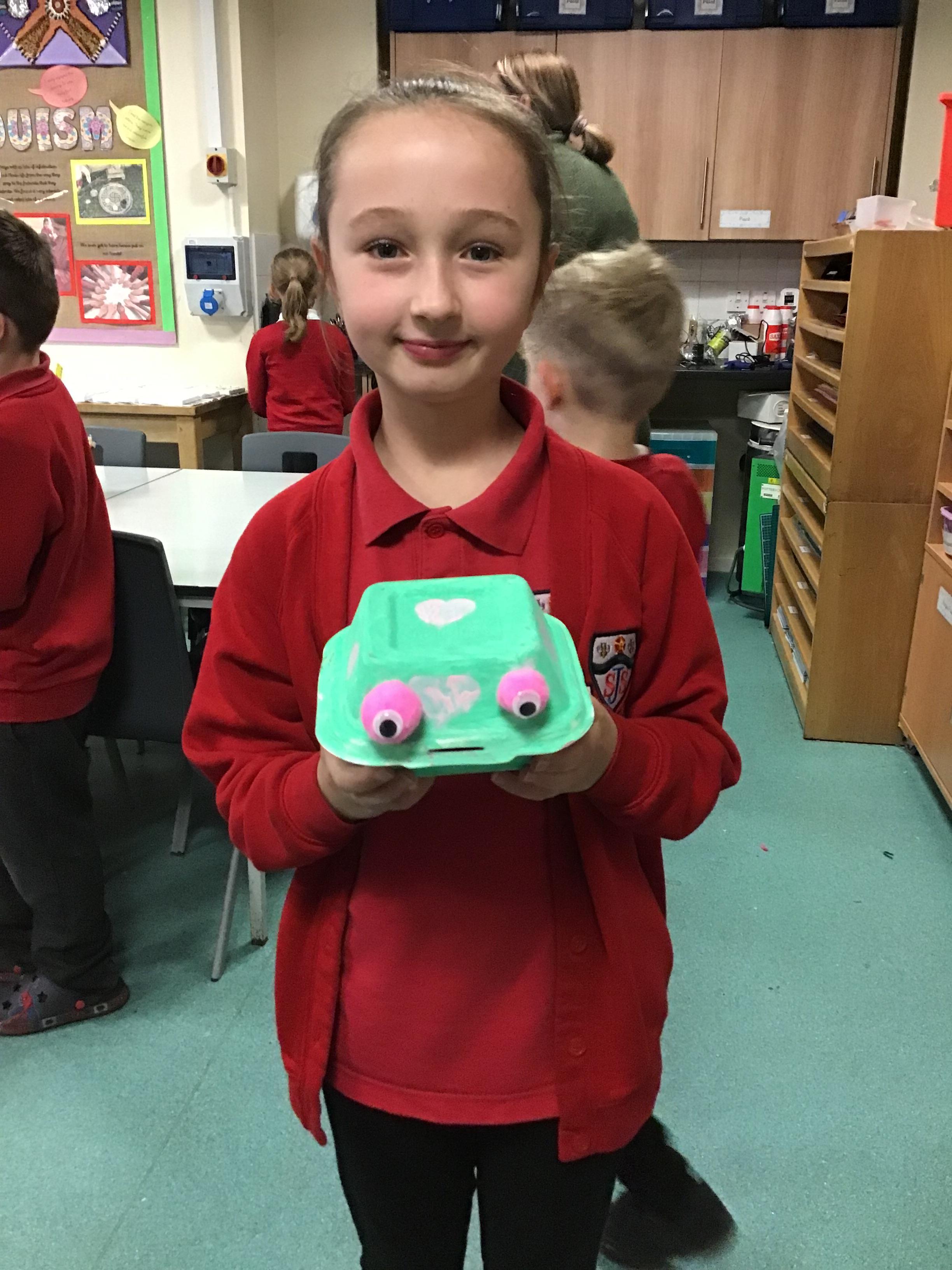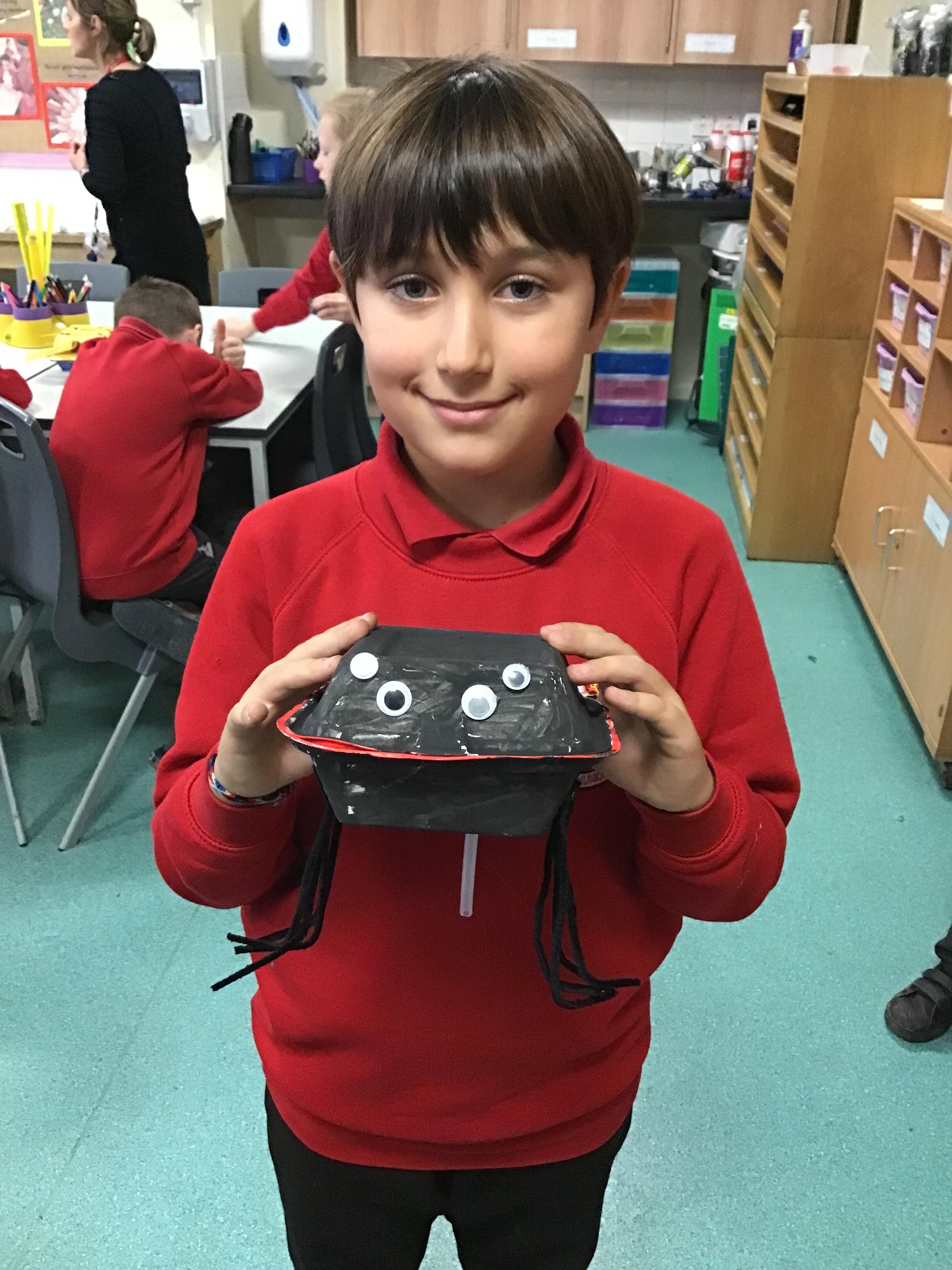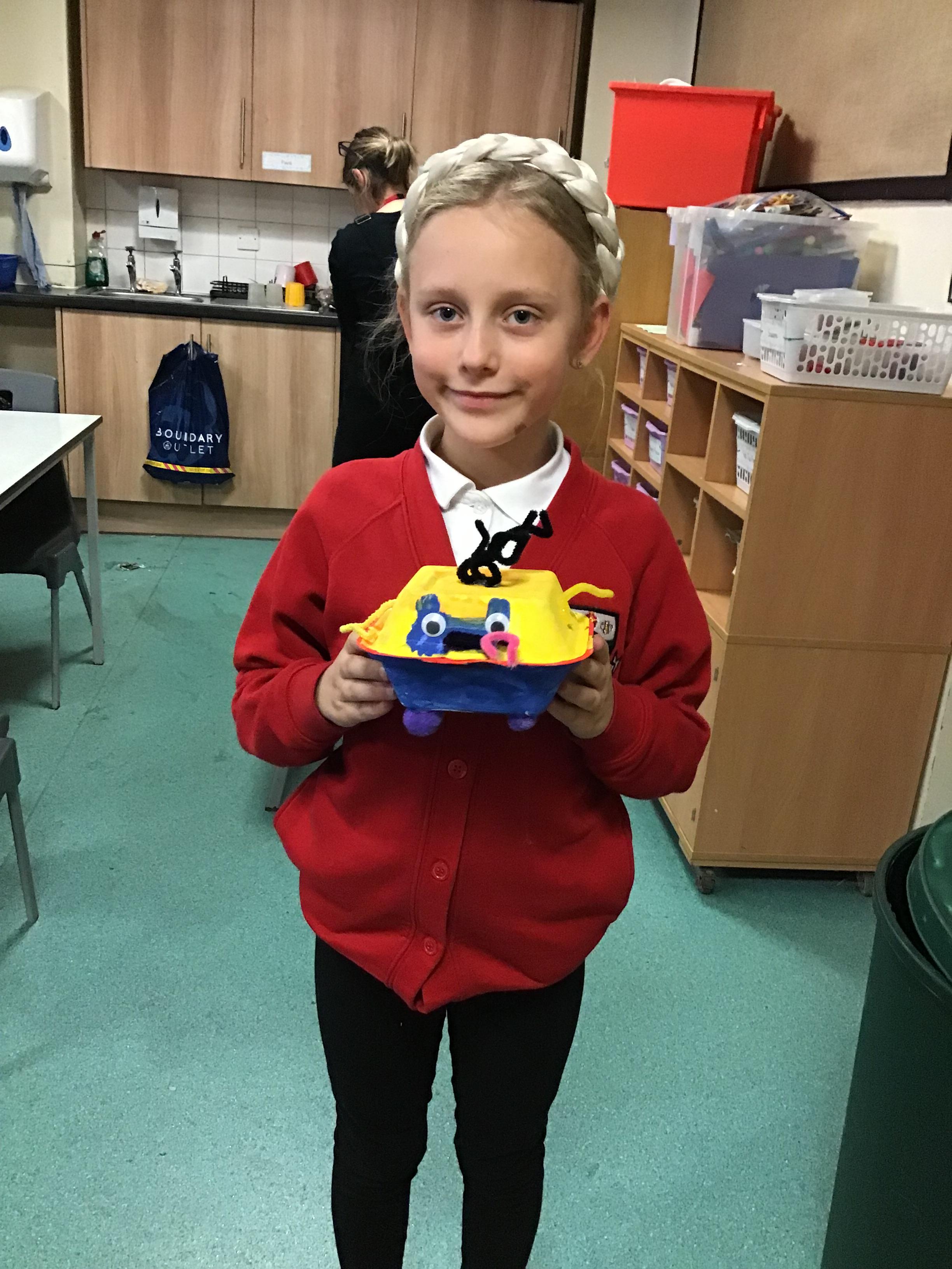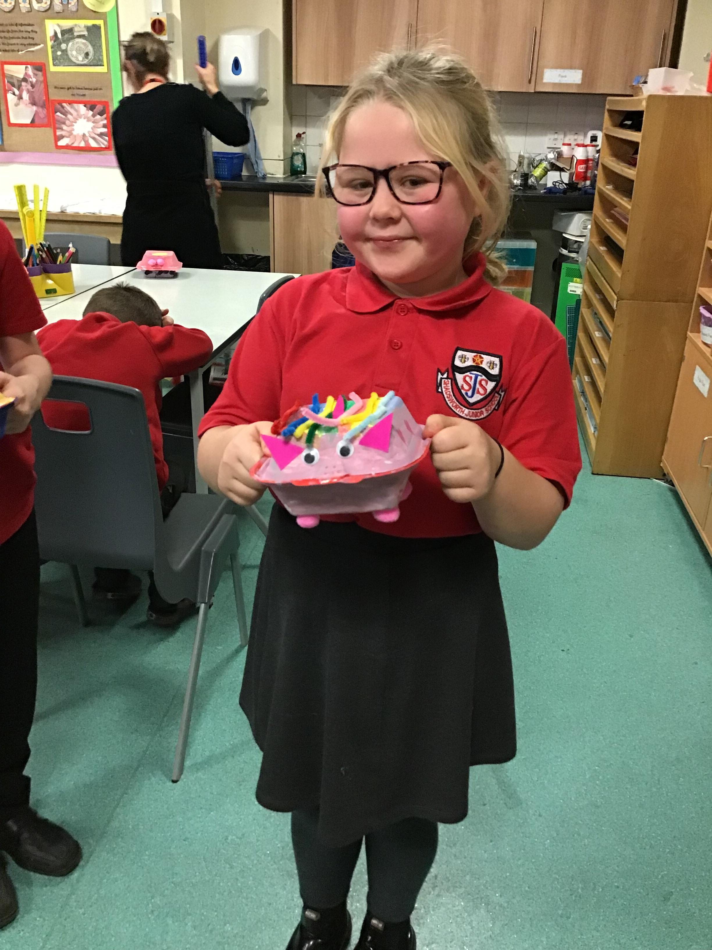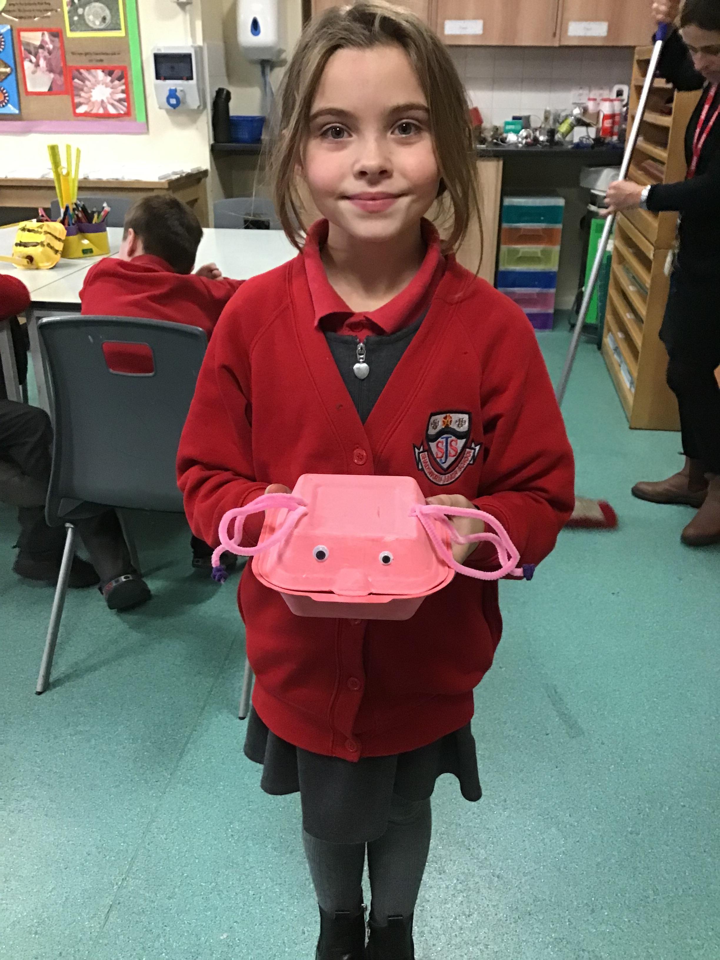 We then spent two weeks creating our final pieces. First, we looked carefully at our plans before painting both the inside and outside of our toy. We then had to let them dry before adding the decoration. We used a variety of different materials to do this such as googly eyes, fluffy pom-poms, pipe cleaners and different coloured paper. We had lots of fun creating our final pieces and checking that they work by blowing up the balloon inside. We are all really proud of how they look and couldn’t wait to take them home to show our families.