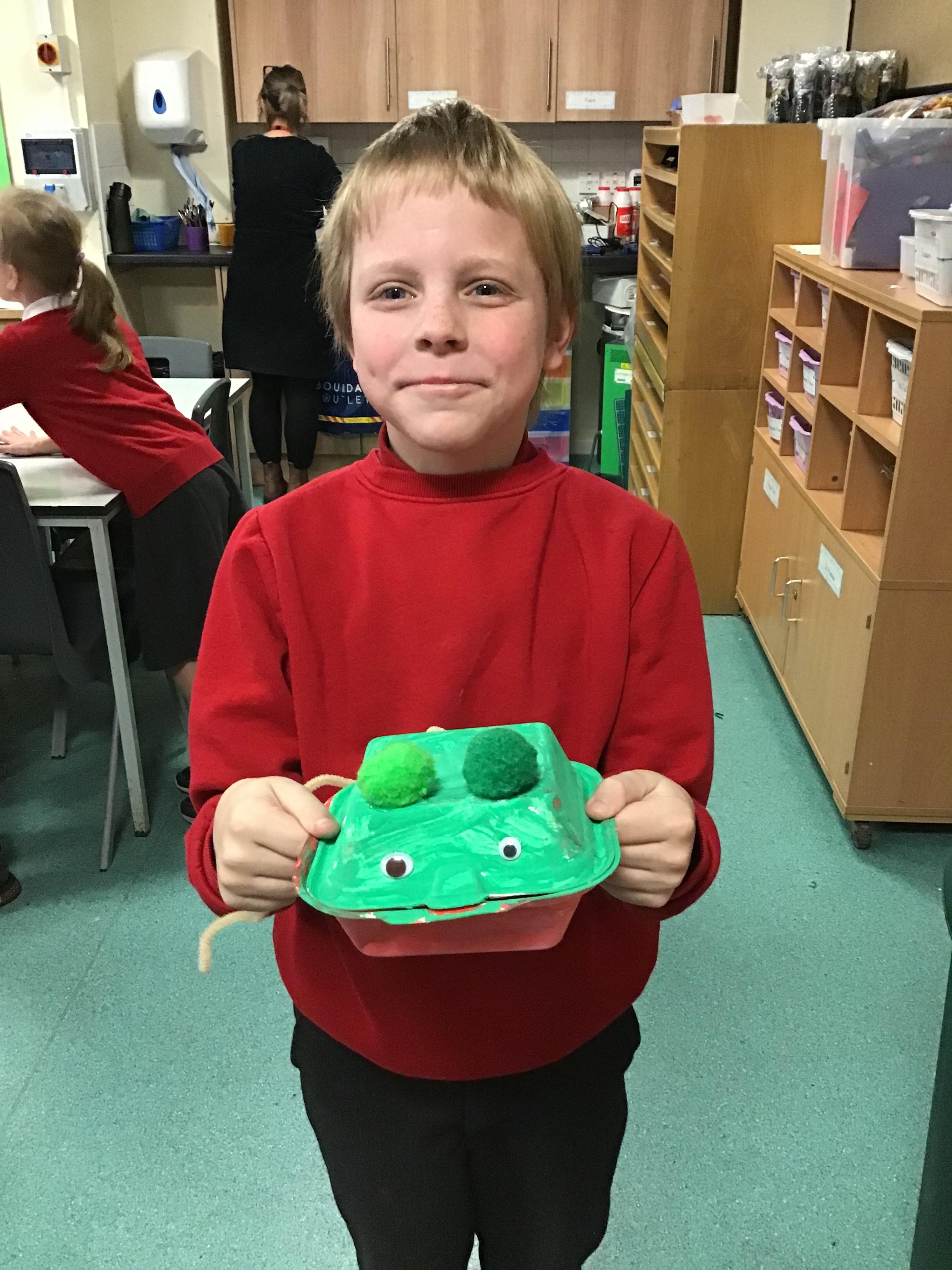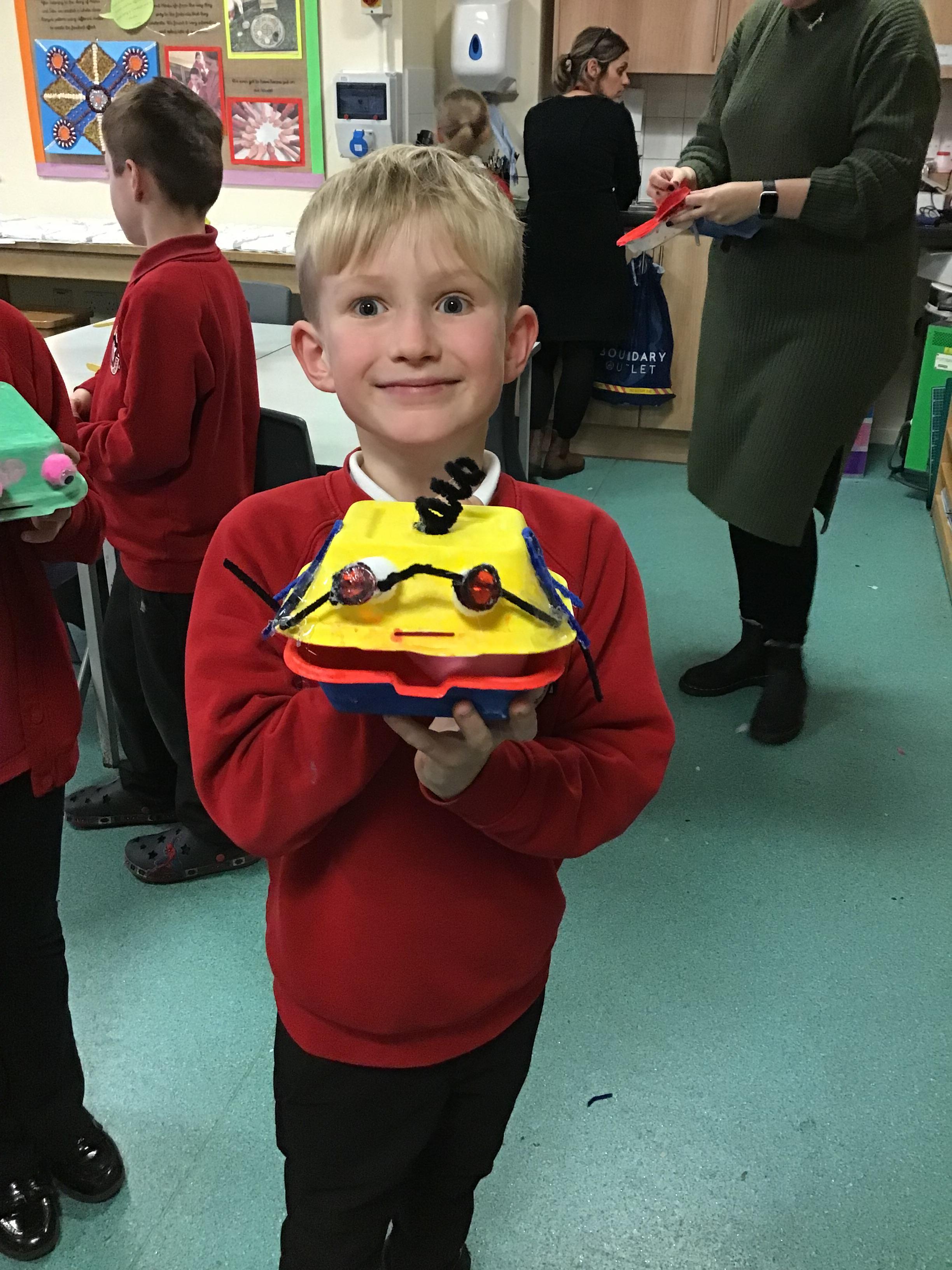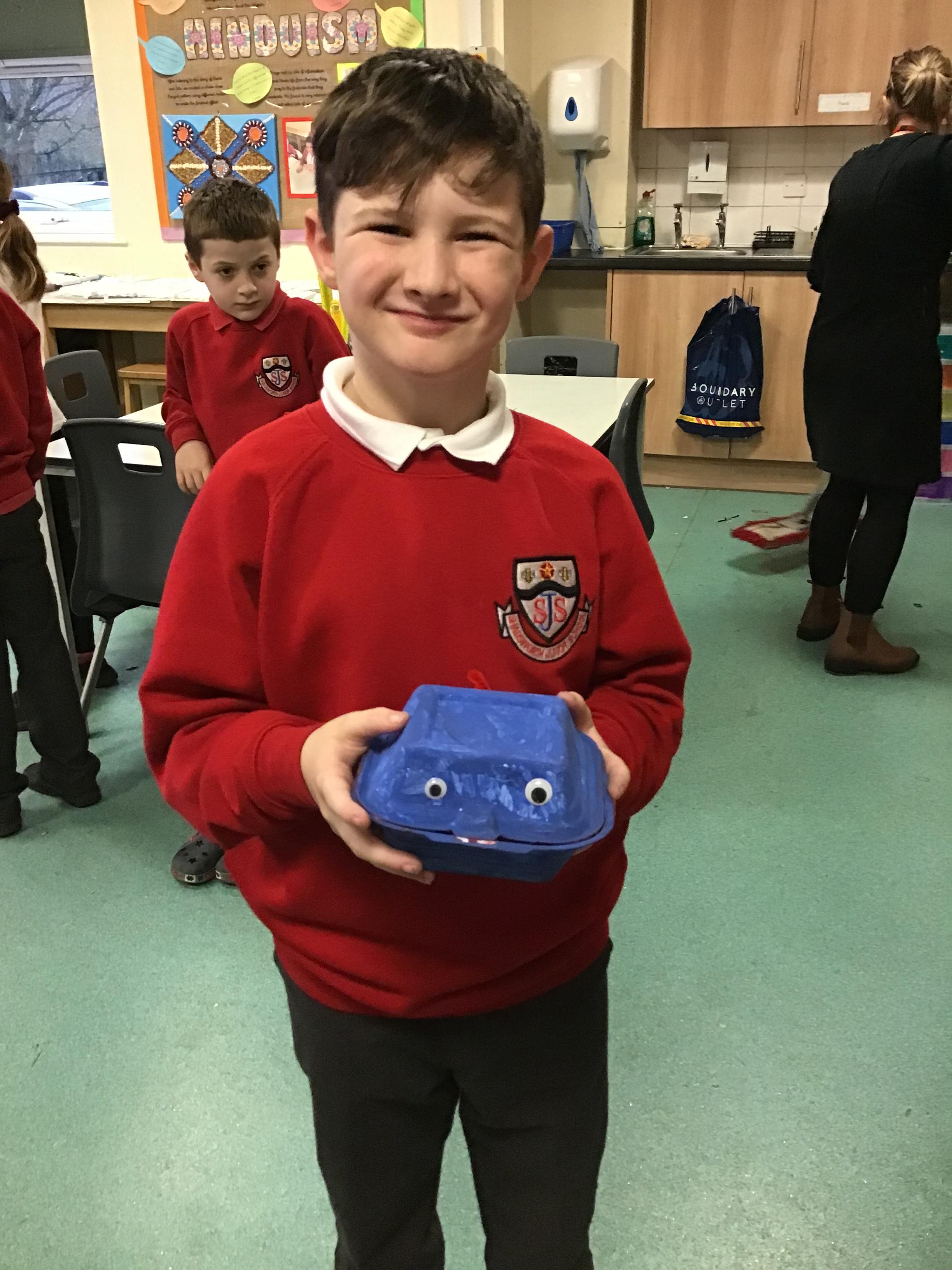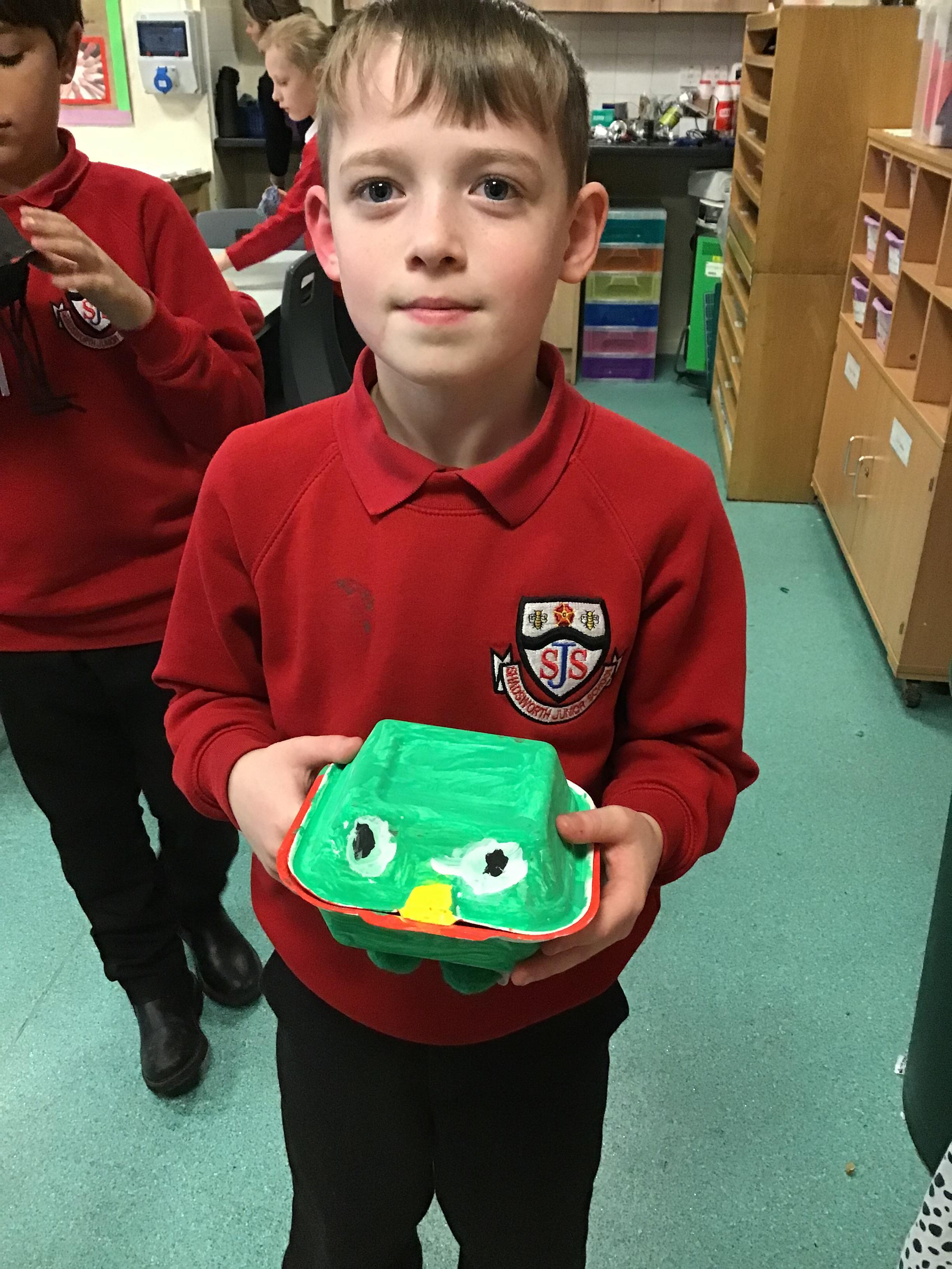 We then spent two weeks creating our final pieces. First, we looked carefully at our plans before painting both the inside and outside of our toy. We then had to let them dry before adding the decoration. We used a variety of different materials to do this such as googly eyes, fluffy pom-poms, pipe cleaners and different coloured paper. We had lots of fun creating our final pieces and checking that they work by blowing up the balloon inside. We are all really proud of how they look and couldn’t wait to take them home to show our families.