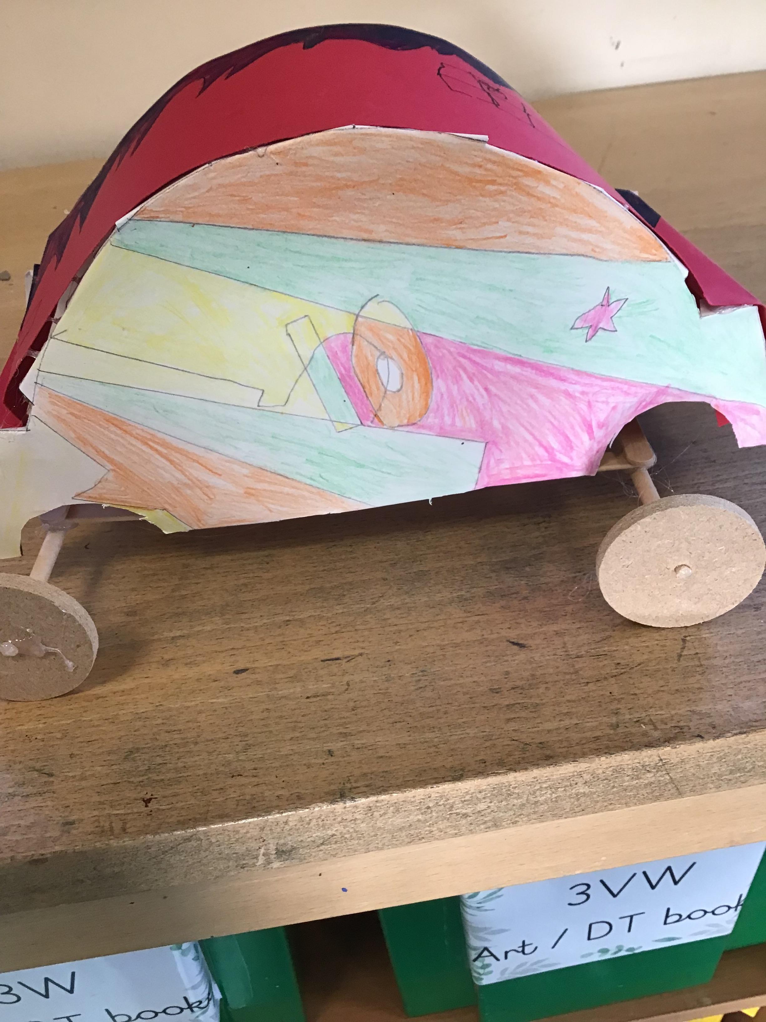 We had lots of fun planning and getting all of our ideas onto paper! It was then time to assemble our car chassis, axles with working wheels and a launching mechanism. We then designed and carefully cut out our side panels and roof of our car. This was a little bit fiddly because we had to carefully cut around the tabs. Finally, we secured our side panels and roof to our chassis.